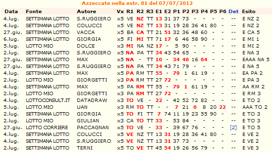 in data:09/07/2012 Come consuetudine, elogiamo Max de "La Settimana del Lotto", che centra una quaterna con una previsione di cinque numeri, nel conc. 81 del 07/07/2012 con esito: 10-34-46-64 al 5° colpo su Napoli. Complimenti.
