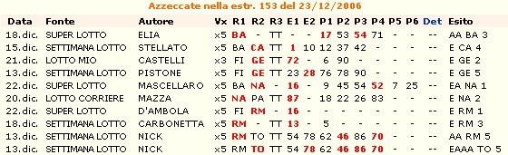 in data:27/12/2006 Come di solito in questi casi, elogiamo Nick, de "La Settimana del Lotto", che centra una quaterna con una previsione in sestina, 78-46-86-70 al 5° colpo su Torino. Da notare, con stessa previsione, anche l'ambo 46-70 su Roma. Complimenti.